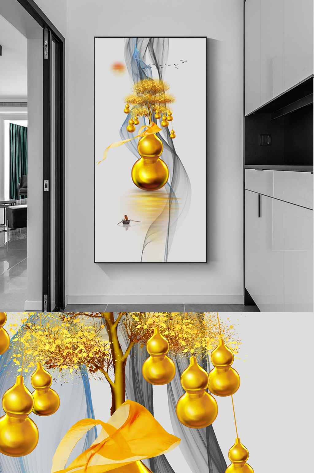 新中式葫芦发财树彩带红日飞鸟玄关装饰画 玄关 原文链接:https://www.zuotuwang.com/decoration/hallway/49.html,转载请注明出处。 发财树彩带新中式玄关红日葫芦装饰画飞鸟
