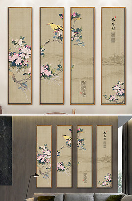 新中式花鸟四联竖幅古典古色长方形无框装饰画 玄关 原文链接:https://www.zuotuwang.com/decoration/hallway/7.html,转载请注明出处。 古典古色四联新中式无框竖幅花鸟装饰画长方形