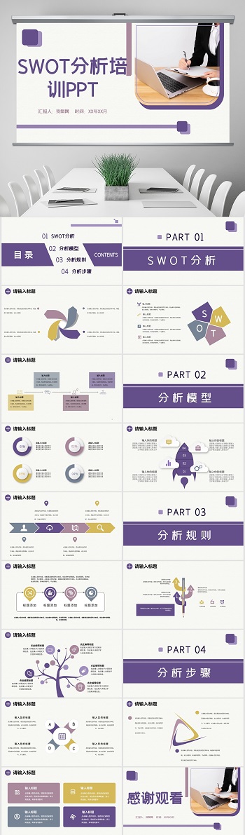紫色PPT企业SWOT分析数据分析PPT总结培训 PPT 原文链接:https://www.zuotuwang.com/ppt-word-excel/ppt/28.html,转载请注明出处。 PPTSWOT分析培训总结数据分析紫色